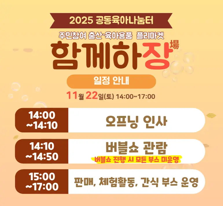 서대문구 공동육아나눔터에서 가을을 맞아 출산·육아용품 플리마켓 ‘함께하장’을 개최합니다. 이번 행사는 2025년 11월 22일 토요일 오후 2시부터 5시까지 홍제 1동 자치회관 5층 대강당에서 열리며, 판매자, 구매자, 물품 기부자, 자원봉사자 모두 참여할 수 있어요. 아이들이 좋아하는 버블쇼, 출산·육아용품 나눔 장터, 체험활동 부스와…